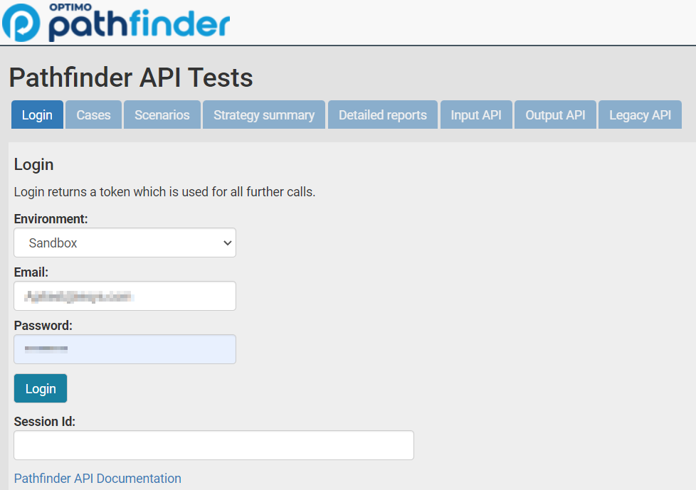 If you have not been given a log in by Optimo Financial, please Contact Optimo Financial , and request a developer log in to the sandbox (do not use the 'Set up my login' button on the login page, because that login will not give you access to the API test view)