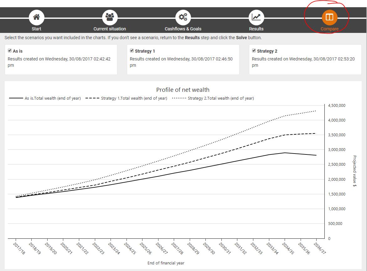You will find the compare step on the top menu, and you can choose which scenarios should be shown on the charts.