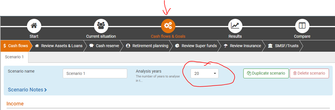 You can choose the number of years in the 'Analysis years' field at the top of the 'Cash flows and goals' step
