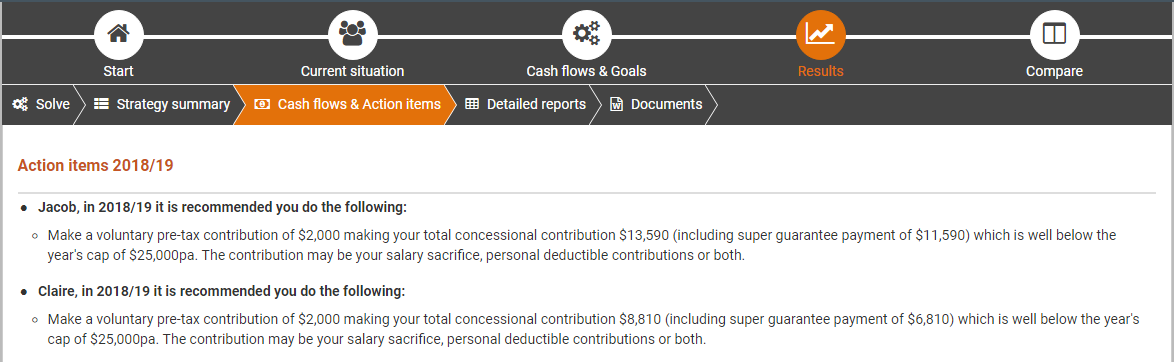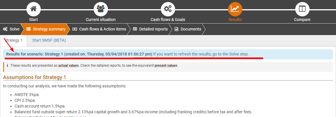 Make sure you click the Start solve button to refresh the results - this will generate new results with an improved methodology (i.e. you may have different numbers) and more comprehensive SMSF results (i.e. more charts and stuff)