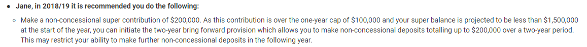 For example, in this case, the bring-forward rule is triggered in 2018/19 and the individual's balance is between $1,400,000 and $1,500,000, so Pathfinder uses the two-year bring forward rule and explains what rules it's keeping to: