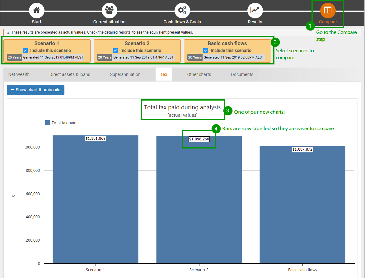 At the Compare step, we've added more bar charts, and labelled the bars with values, so it's even easier to compare scenarios.