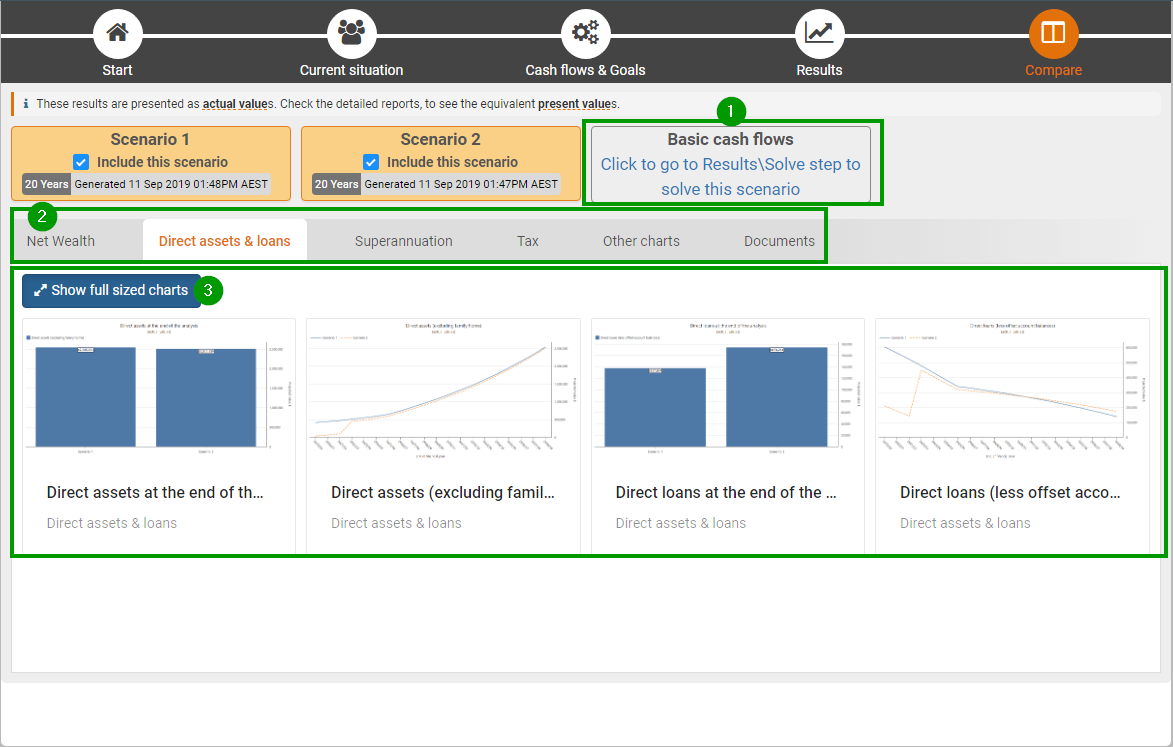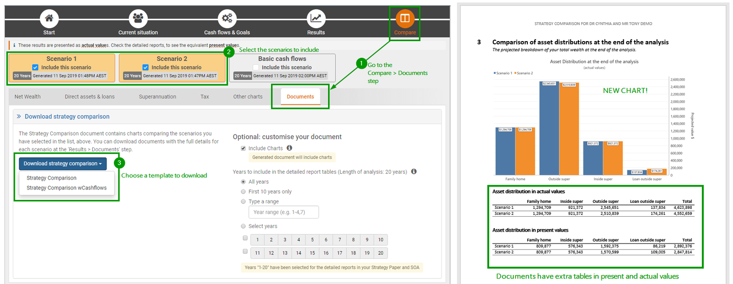 You can now download the compare charts into a document at the Compare > Documents step. This document can help your clients compare different aspects of the scenarios to help them make an informed decision. You can also use the comparisons to demonstrate the value of your advice.