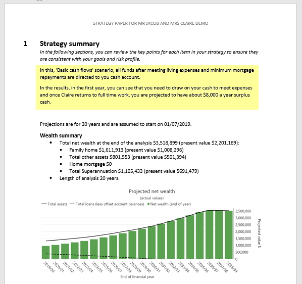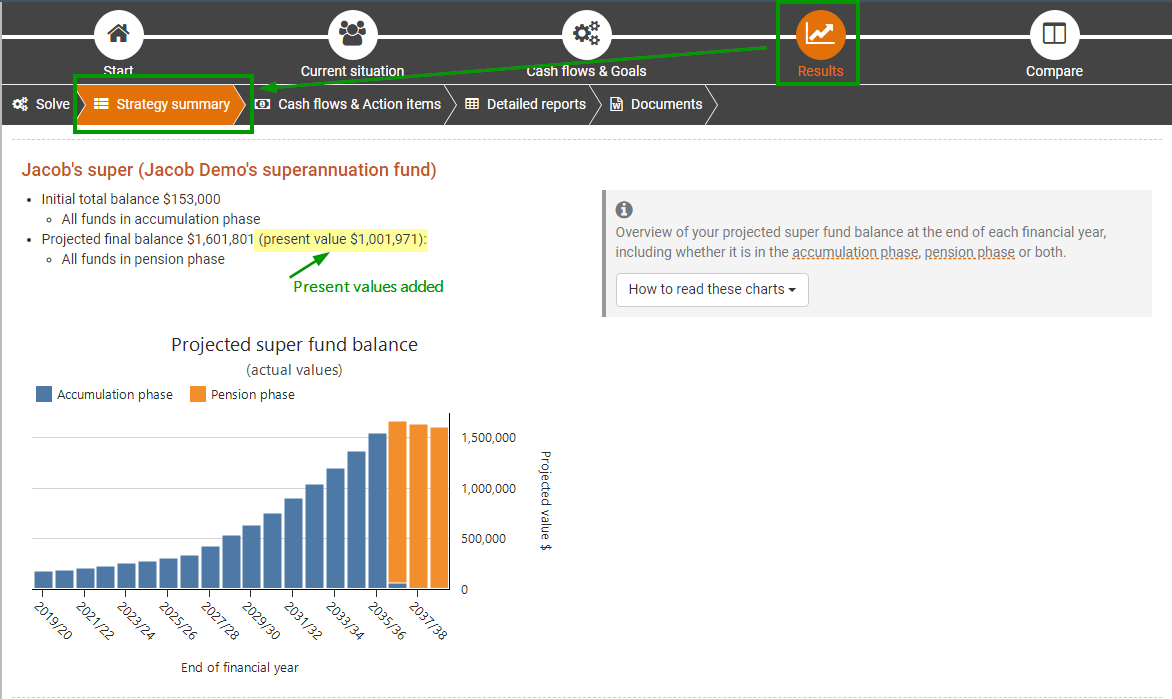 At the Results > Strategy summary step, asset and super balances at the end of the analysis now show the present values in parentheses. This saves you having to look up these values on a separate report.