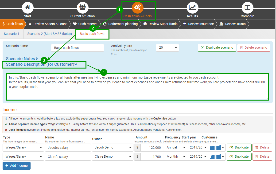 You can now write notes in the 'Scenario description (for Customer)' field (at the Cash flows & Goals step), and the notes will appear in any results document you download. You can use this field to write a short description of what has been modelled and comments on the results (see our sample cases for examples).