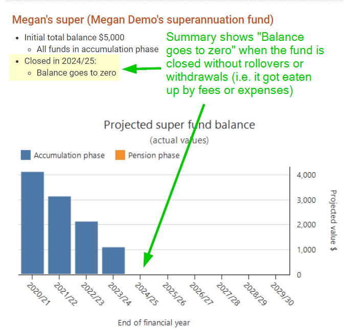 In the results, at the Strategy summary step, we've always covered the most common ways for opening and closing a super fund, and now, after reviewing your feedback weâve made some improvements to more elegantly cover some rarer edge cases. So, if you start an SMSF with contributions and no rollovers, or your super fund closes because the fees ate it up, the reports will look neat.