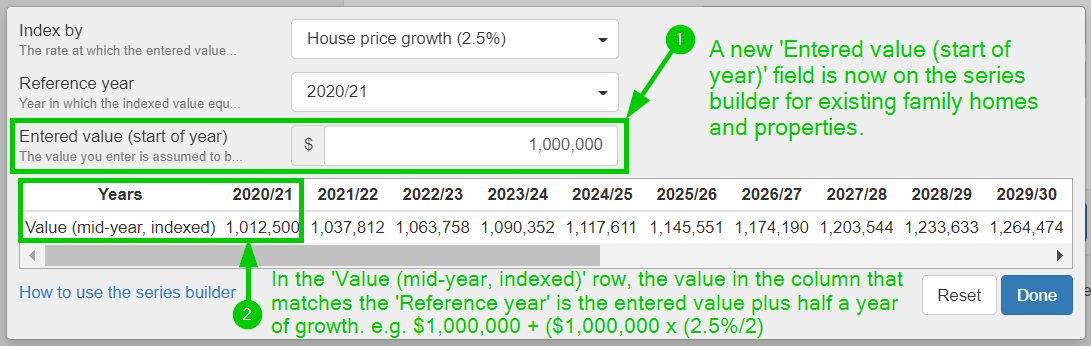 The main change you will see in the data entry is on the series builder on the Property value $ field. When you enter a property value on the main form, if you open the series builder, it will appear in the new 'Entered value (start of year) field in field series builder: