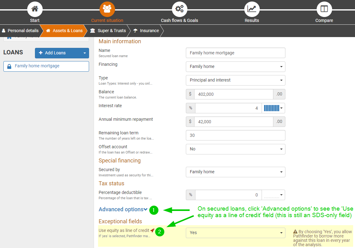 On existing Secured loans, weâve moved the âUse equity as a line credit fieldâ into the âadvanced optionsâ section. We did this because new users were accidentally changing it to âYesâ, so we thought weâd make it less tempting. Weâve also added a validation to remind you that this field may not do what you think it does. In most cases, this field is left as the default âNoâ, so this change shouldnât really affect many cases.