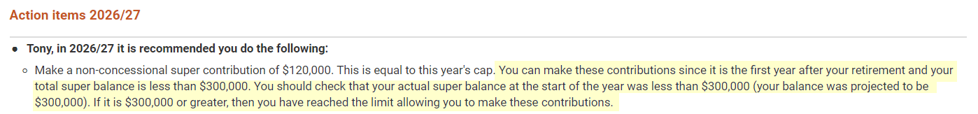 We have also implemented an earlier Bill ("More Flexibility for the work test") that allows from 1 July 2019 Australians aged 65 (now 67) to 74 with a total superannuation balance below $300,000 to be able to make voluntary super contributions and receive spouse super contributions for 12 months from the end of the financial year in which they last met the work test. If this rule is applied in your case, it will be mentioned in the action items: