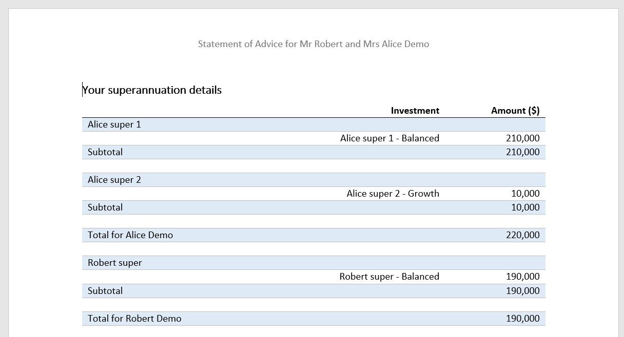In the SOA foundation template, the ‘Your superannuation’ table would incorrectly list funds twice if the case had a couple, and so it had a comment to check this table manually. This has been fixed, so you no longer have to manually correct it.