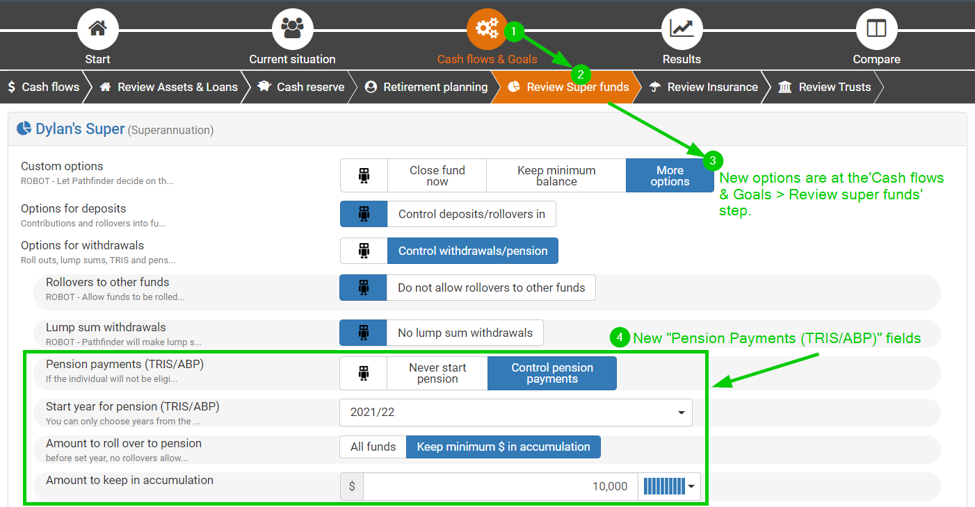 On superannuation funds (at the Cash flows & Goals > Review super funds step), there are now the following new options to let you control account-based pensions and TRIS (in addition to the default 'Robot' option):