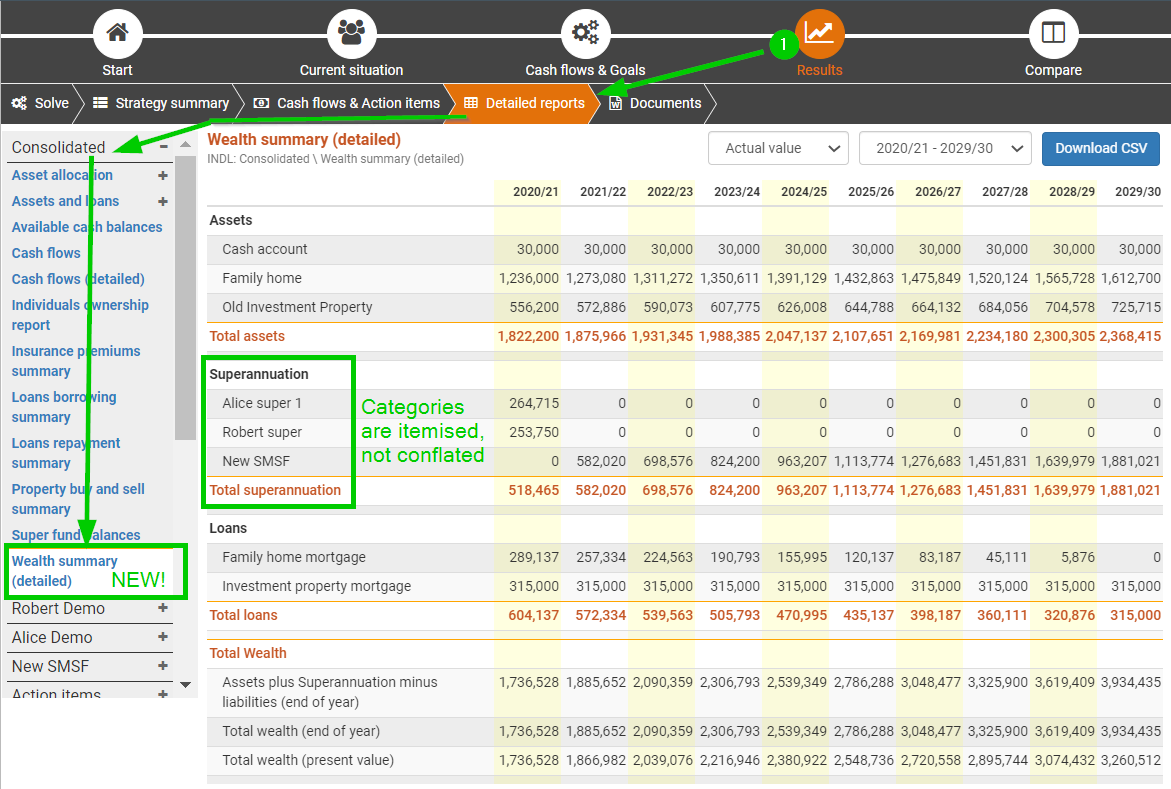 In the Detailed reports, under Consolidated, there is a new report called 'Wealth summary (detailed)', which is an itemised version of the top 'Consolidated' report (which conflates into categories). This report has been added to the 'Strategy Overview' template, to accompany the cash flows report.