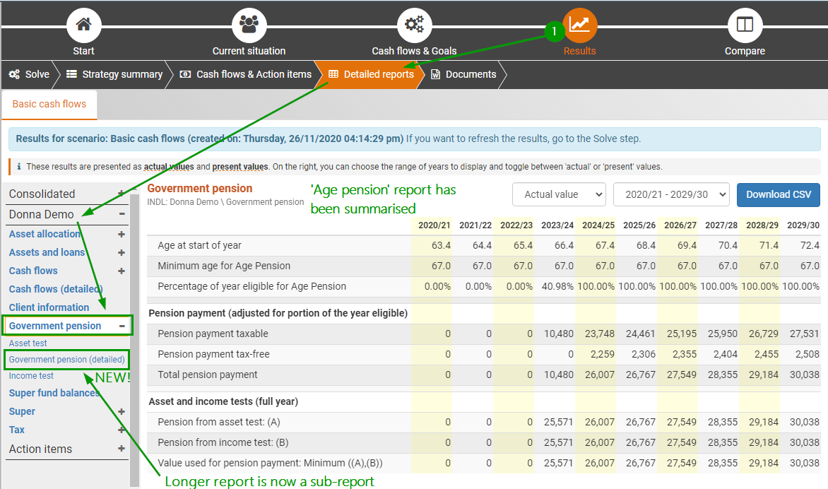 The 'Government Pension' reports for each Individual, which show the Age Pension payments and calculations, have been changed to help you find the right information at the right time: