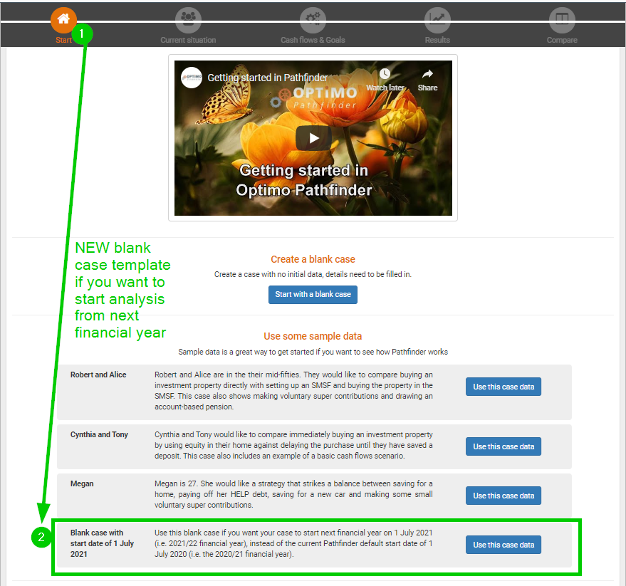 The default start date for cases is currently 1 July 2020 (2020/21 financial year). However, if you would prefer to start you case from the next financial year, (1 July 2021, 2021/22), then: