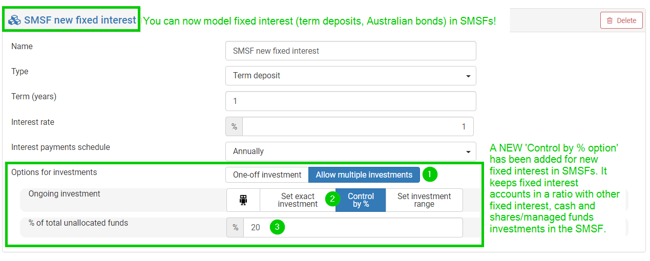 You can now add fixed interest accounts (term deposits and Australian bonds) to SMSFs, and keep new fixed interest accounts in a ratio with other assets in the SMSF with the new Control by % option.