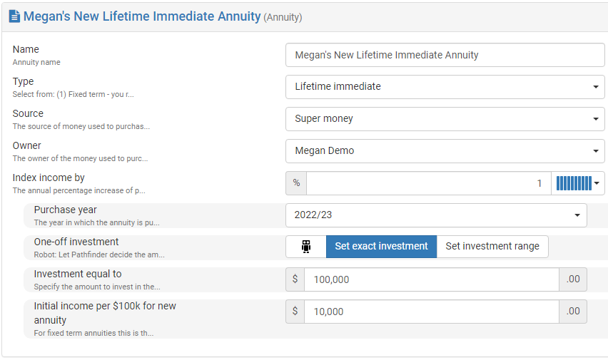 ‘Set exact investment’, ‘Set investment range’, or let Pathfinder optimize how much to invest in a proposed annuity.