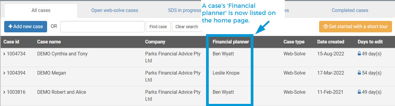 On the home page, the ‘financial planner' for each case is now listed on the home page, to help make it easier for organisations that have multiple log ins.