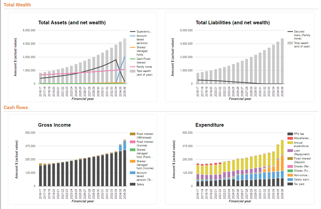 The charts are some 'colour and movement' to help you see general trends or exceptional amounts. Keep an eye out for the super/pension zig zag on the total assets chart it indicates the start of TTR or an account based pension! After the charts is a summary report that lists each item of interest in the analysis and give you some key points, usually the initial and final values, and a note on anything interesting that happens in between. These summaries are similar to our popular 'Action items', except they describe what happens to an item over the years, instead of the actions for all items for just one year. If the charts and results summary text look good, then you can scroll down and check the detailed reports. For more information about reviewing the results, see How to read the websolve results. |