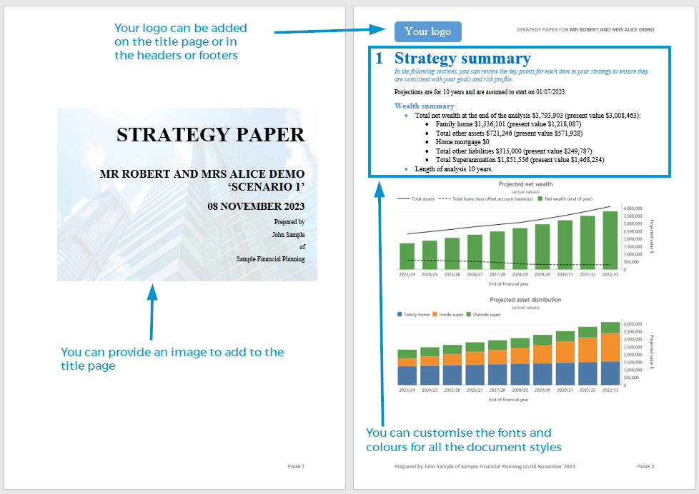 Custom styles - For the default Strategy Paper, Strategy Overview, SOA and Scenario Comparison documents, we can change the colours, fonts and logo to match your house style. We can also add a new title page or adjust the existing one, and add some boilerplate text (e.g. disclaimers after the title page). See below, for an example.
