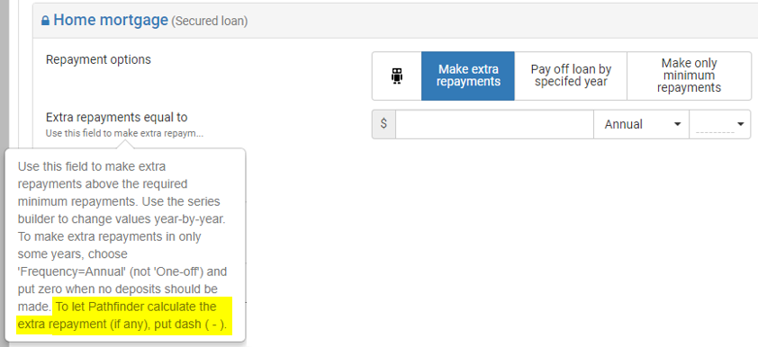 If you let Pathfinder calculate loan repayments, it will make extra repayments if the individual can afford it and if it will maximise total wealth under the given assumptions and other constraints in the case. Depending on the case, this may mean Pathfinder will not make any extra loan repayments at all or it can make very large repayments, so eyou should check the results to see whether the calculated strategy is acceptable. (Also note that for loans, the 'Pay off loan by specified year' is also a good option).