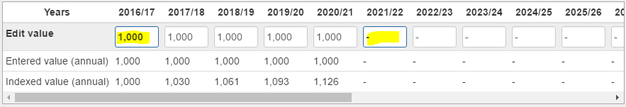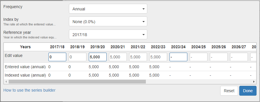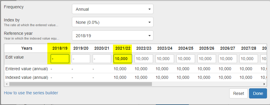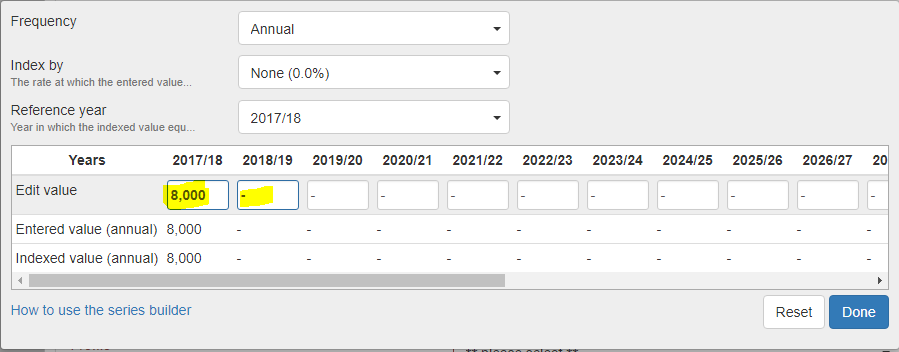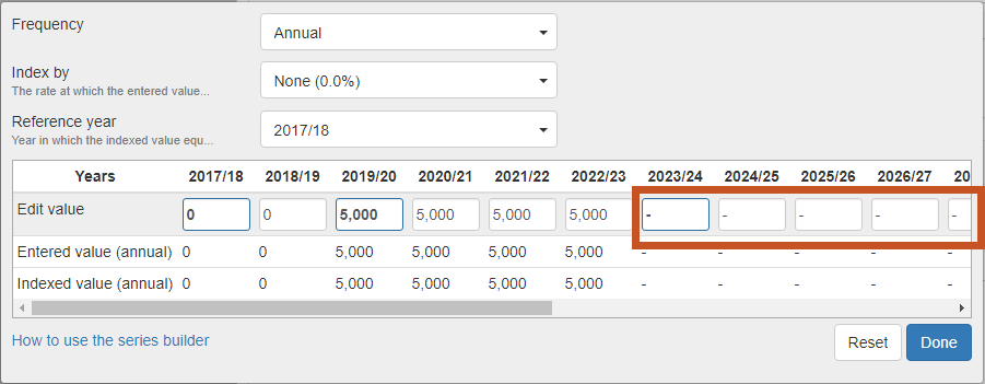 In some fields, you can use the series builder to set a specific value in some years, and put dash ( - ) to let Pathfinder calculate the value in other years when you’re setting instructions for any of the following: