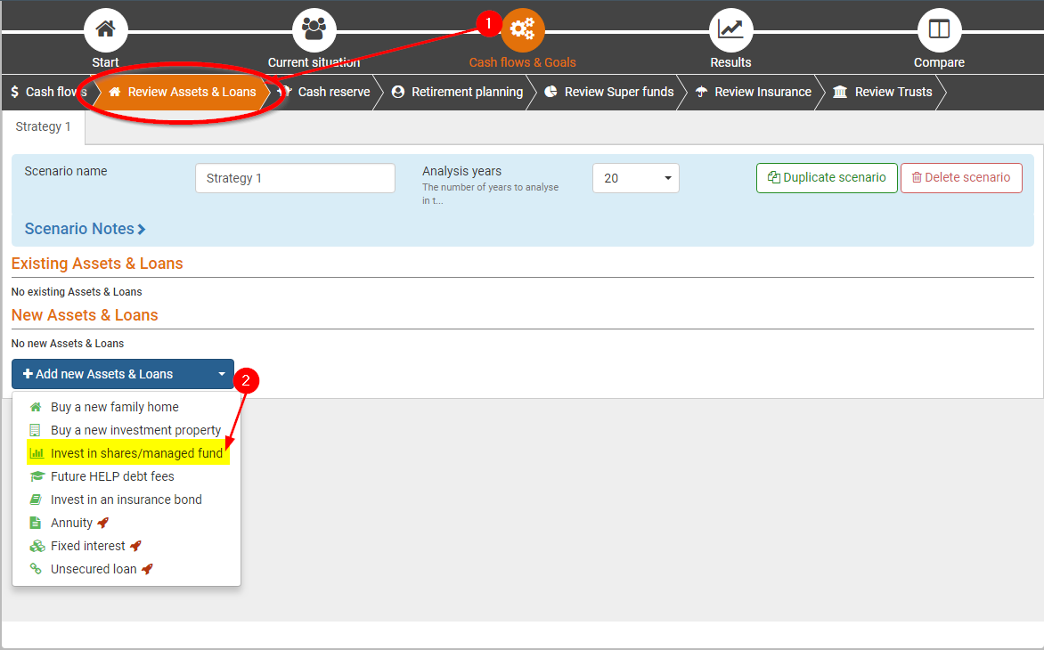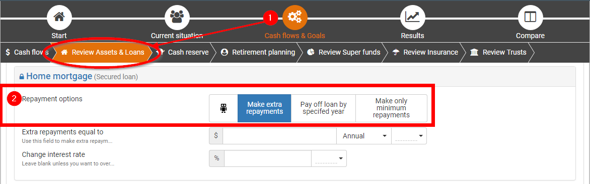1 | Go to the Cash flows & Goals step (top menu), then the Review Assets & Loans sub-step. | |