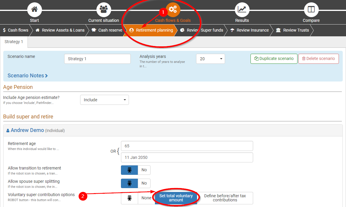 | 2 | We would like to control the total voluntary super contribution amount, and let Pathfinder work out whether it's better to make contributions before or after tax (or both), so for the Voluntary super contribution options field, choose the Set total voluntary amount option. | |