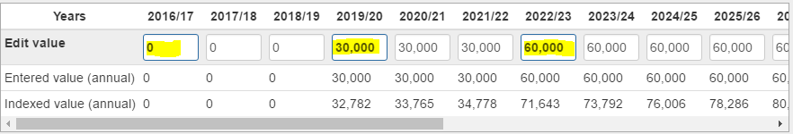 In this example, the individual's income is zero for the first three years (e.g. because they are on parental leave), and then has 3 years of part-time work ($30,000) and then changes to full time ($60,000):