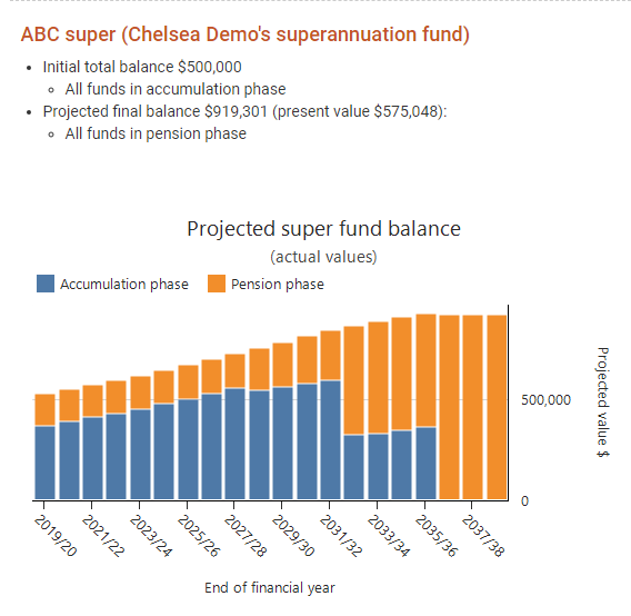 If you already have results, check if roll backs from the pension phase to the accumulation phase are happening in the super fund | 1. At the Strategy summary sub-step (under the Results step on the top menu), find the box for the super fund. If the chart shows has a year where funds are in the pension phase, and then in the next year more funds are in the accumulation phase (and the change in the total balance hasn't changed much), this usually indicates a roll back is happening. 2. In the action items, there will be a an action item saying something like "Rollover $462,602 from the Pension phase into the accumulation phase of your 'ABC super'." |