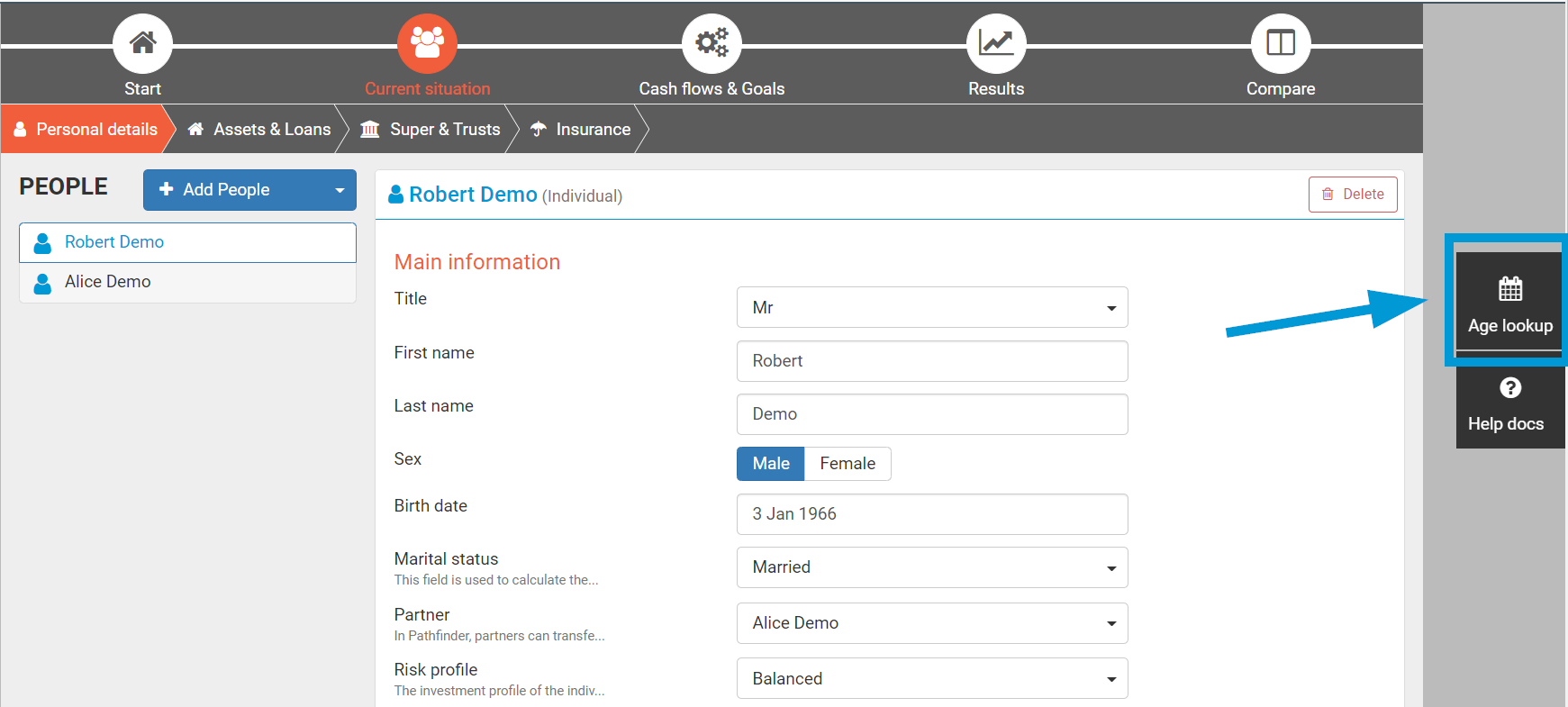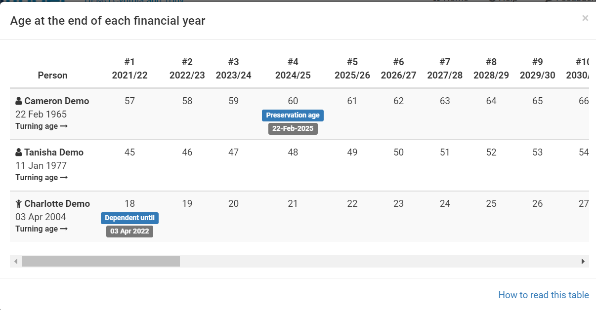 The Age lookup table is useful for finding the corresponding financial year for an individual's or dependent's age (or vice versa). It also labels useful milestones such as preservation age, age pension age and the year a child stops being dependent.