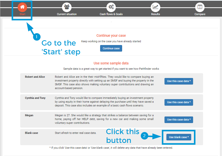 - Click the 'Use a blank case' button (at the end of the Use some sample data' section). This will clear any data you have entered and you can treat the case as a new one. For more information about editing data, see Entering Data in Pathfinder.