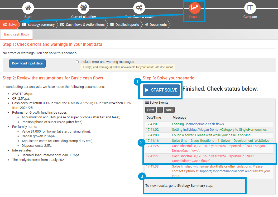 Solve the scenario | If you are happy with steps 1 and 2, in the step called Step 3: Solve your scenario, you can start the solve to generate the results (these steps are numbered in the screenshot, below):