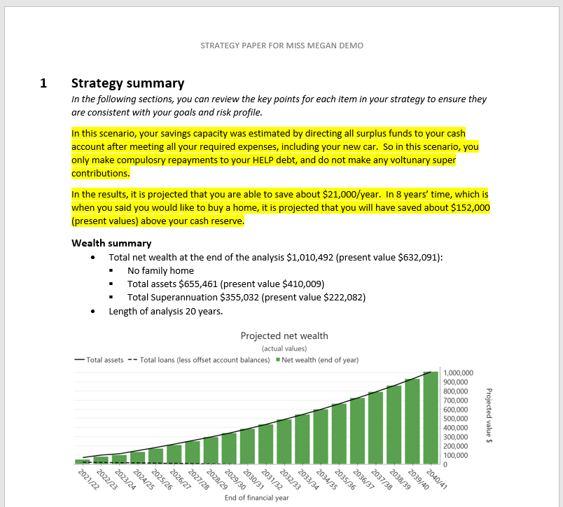 Your description will appear in any results documents you download | For more about downloading documents, see How to download results into a document (Strategy Paper, SOA (Statement of Advice) Foundation document, Strategy Comparison). At the Results > Documents step, the description will appear in the following templates in the following sections: