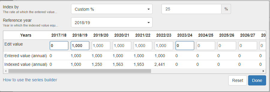 Tip for entering deposits that keep to the 125% rule | If you would like to enter a series of deposits where each deposit is 125% of the previous year's value, you can enter the first deposit, and then use the series builder to calculate the subsequent deposits: