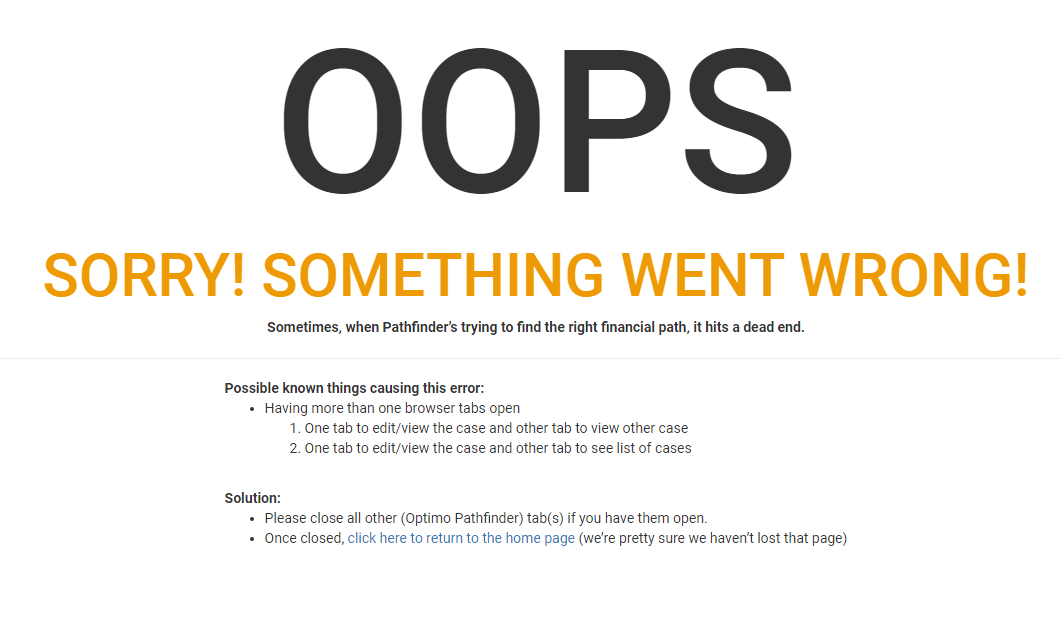 - Check if the case is open in another tab, window or on another device. If so, make sure it's only open in one window in one device. If you are sharing the log in with another person, this is more likely to happen, so you can Contact Optimo Financial to get your own log in.