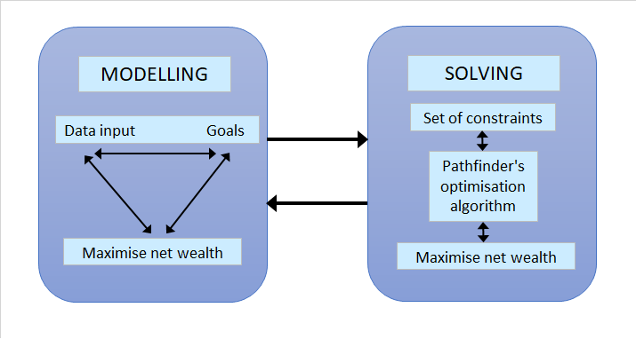 An overview of the interaction between data input, setting goals, and maximising your clients' net wealth through our optimisation algorithm can be seen as follows: