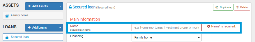 - For secured loans, put 'Loan' in the name, to distinguish it from the asset. If you give it the same name as the asset, then in your results you'll see two items with the same name, which can be confusing. e.g. Call a mortgage 'Investment property loan', not just 'Investment property'.