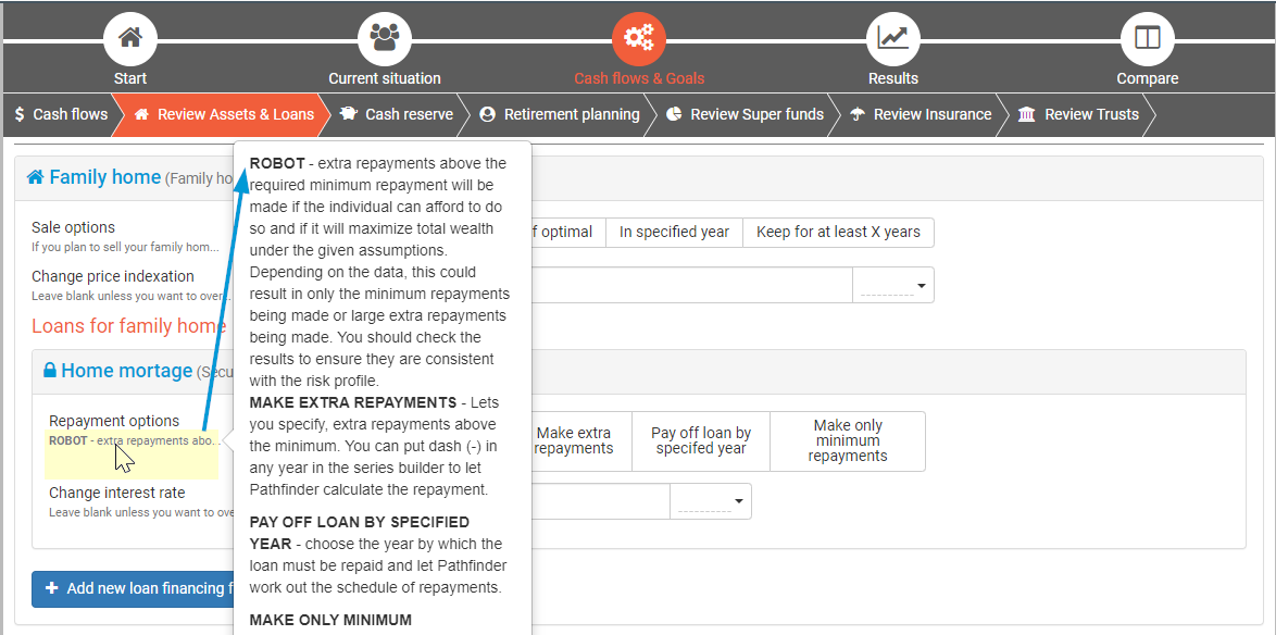 If you select this button for a field, then you are using Pathfinder’s powerful optimiser. This button is ideal for anything where there isn’t a personal preference, because it will give you an idea of feasible values, which you can then adjust if required. Broadly, if you choose the Robot button for a field, Pathfinder will calculate the amount so that it maximises the case’s net wealth at the end of the analysis while also not breaking any legislative rules, causing a clash with other goals or causing a cash shortfall. It will also take into account, and even take best advantage of, government benefits and tax rules. Using the robot can save you time because it’s easier to click ‘Robot’ then calculate a value and input it and it may even remind you of stratgies you hadn’t initially considered (e.g. spouse super contributions). However, you should also be aware that it may not take into account all your clients' circumstances or risk, so you should check the results to make sure they are appropriate. If you don't like the results, you can choose a different option from the robot, and try again.